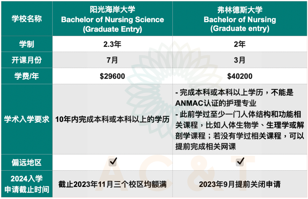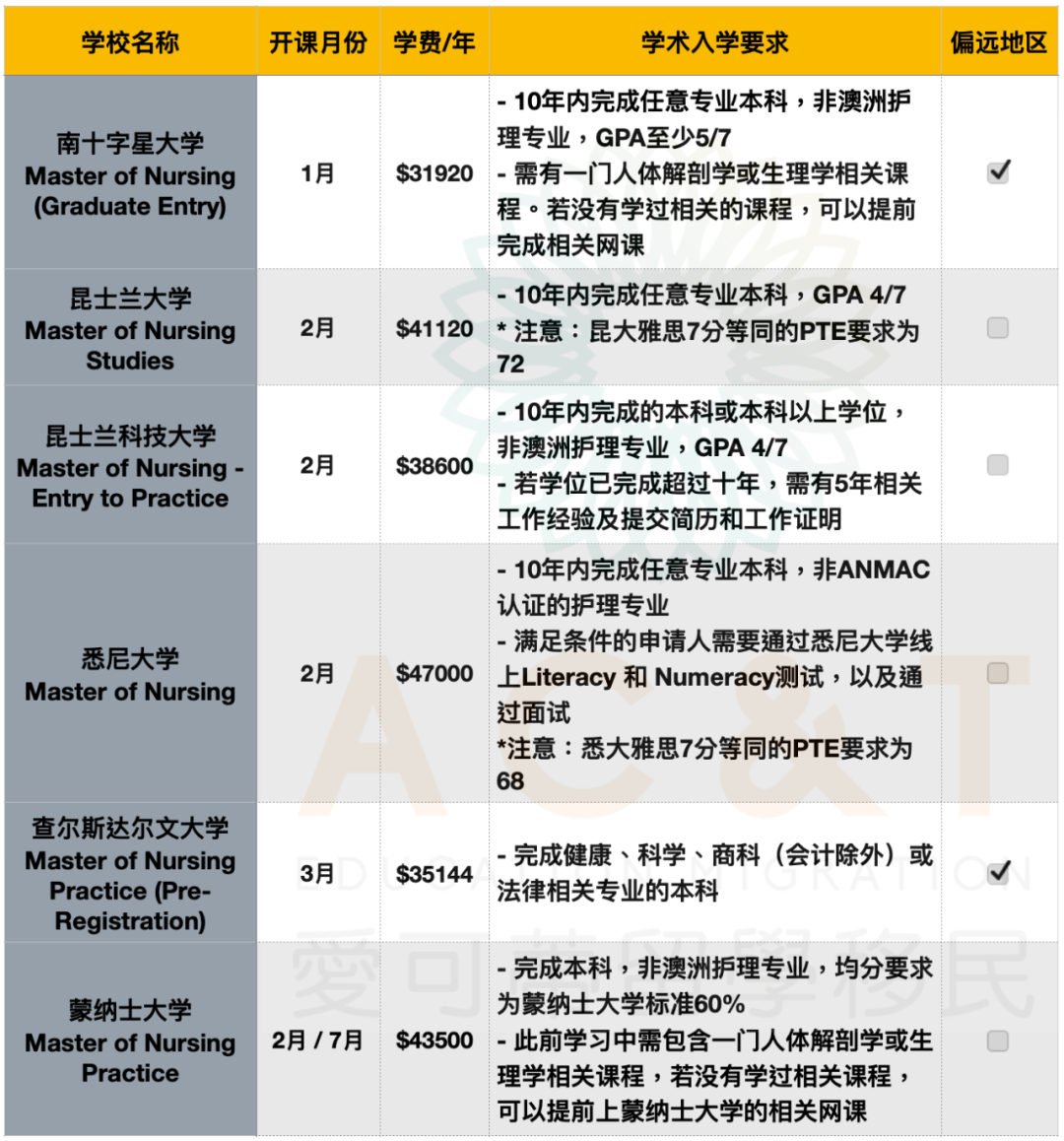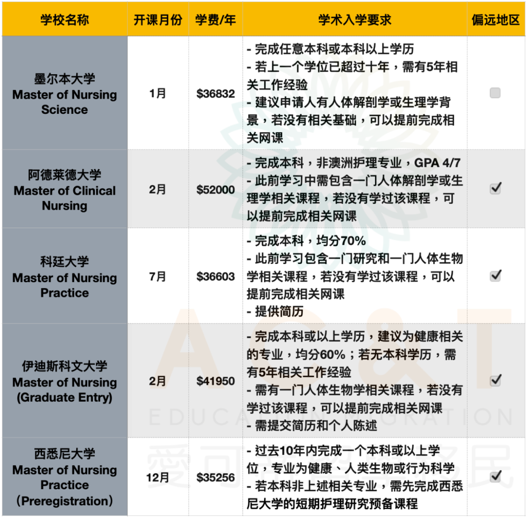 爱可蒂关于护理专业的申请Tips: - 建议至少提前半年申请,部分学校建议至少提前一年申请 - 申请之前建议已经有达标的英文成绩,雅思4个7或同等的PTE或OET成绩 以下我们就对这三种常见的学历做一个介绍! 01 本科课程 护理专业本科时长一般为三年,常见课程有Bachelor of Nursing。适合高中毕业刚进大学的学生。部分学校还开设护理专业搭配其他专业的双学位,比如护理本科+助产士本科,护理本科+急救本科。 一些热门的护理本科专业如下: ![]() 02 本科Graduate Entry 课程 护理专业本科的Graduate Entry时长一般为两年,常见课程有Bachelor of Nursing (Graduate Entry)。申请Graduate Entry的学生通常需要已经完成一个本科或本科以上的学历(非护理专业)。 目前ANMAC认证的Bachelor of Nursing (Graduate Entry)只有在阳光海岸大学和弗林德斯大学开设,因此这两个学校该课程名额也是异常紧张,通常提前大半年就已经额满。因此建议国际学生至少提前一年联系爱可蒂申请。课程详情请见下图: ![]() 03 硕士课程 护理硕士课程时长通常为两年,常见课程有Master of Nursing Studies。护理硕士适合本科不是澳洲护理专业的学生,或是海外的护理专业学生想转读澳洲注册护士的情况。部分学校要求申请人学过一些健康相关的课程,如解剖学或生理学。 一些热门的护理硕士专业如下: ![]() ![]() 04 护理衔接课程Diploma说明 很多高中刚毕业的同学想要读护理本科,但是迟迟考不到英文,那么你可以考虑先读特定学校开设的健康快捷大一衔接课程Diploma,在读Diploma期间,你除了可以学习护理相关的专业课知识,还有将近一年的时间准备英文考试,为进入护理专业大学第二年做好准备。 热门的快捷大一课程如下: