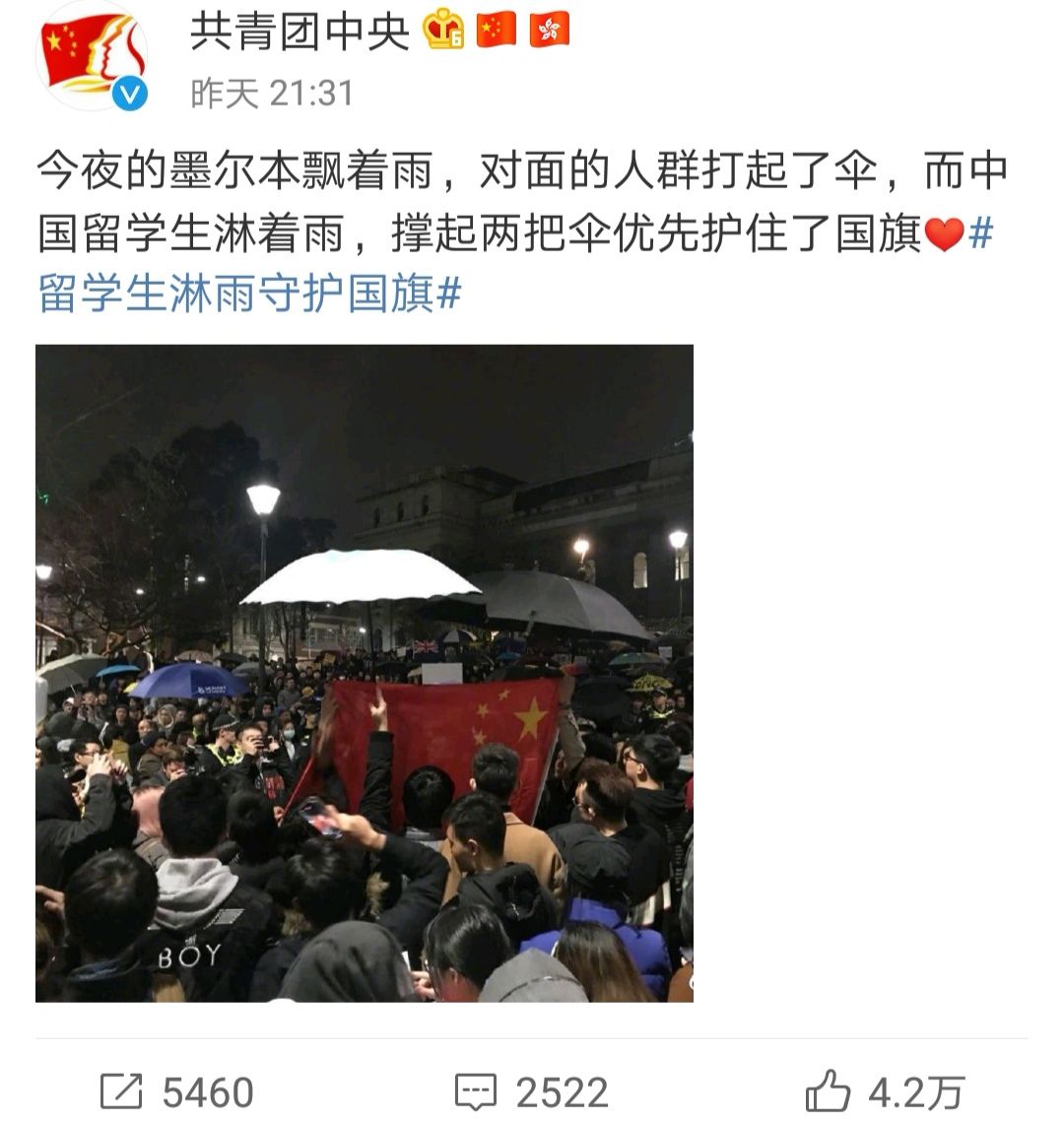 | 自7月以来,澳大利亚多地发生支持香港极端示威者的游行活动,包括昆士兰大学、澳国立大学、莫纳什大学、悉尼大学等。 当地时间16日,在澳大利亚多地发生了妄图乱港分子的集会,数千华人、中国留学生自发来到集会地点,挂起国旗,声援祖国,燃炸了!   华人和留学生们高唱中国国歌 呐喊“中国加油!” 高呼“中国万岁!” 并向全世界宣布 HONG KONG IS PART OF CHINA   墨尔本:爱国者雨中为国旗撑伞 在墨尔本州立图书馆前 部分妄图乱港分子集会于此 中国留学生及在澳大利亚华人 自发前来,将对方团团包围 并唱起了嘹亮的国歌 来源:青蜂侠 许多人举起 手机、平板电脑等设备 将屏幕换成国旗的图片 璀璨的红,在夜空中闪耀  当晚下起小雨 为避免国旗被淋湿 爱国者雨中为国旗撑伞 现场不禁惹人泪目  期间,一名香港示威者试图抢夺 留学生手中的五星红旗 差点发生肢体冲突   但他很快被周围的人群制服 爱国人士重新夺回了国旗 之后齐声呐喊—— “祖国万岁!” 悉尼:爱国留学生高喊 “Hong Kong is part of China” 在悉尼 中国留学生和华人 爱国热情高涨 他们刚下课,才下班 就立刻赶到现场 妄图乱港分子被逼得无路可退  video: https://mp.weixin.qq.com/mp/readtemplate?t=pages/video_player_tmpl&action=mpvideo&auto=0&vid=wxv_945821725395124224 南澳大学:爱国青年迅速集结,高唱国歌 在南澳大学 支持乱港分子的人 公然在校园内搞事 众多中国留学生怒了 迅速集结前往现场 包围对方,高唱国歌!  video: https://mp.weixin.qq.com/mp/readtemplate?t=pages/video_player_tmpl&action=mpvideo&auto=0&vid=wxv_945842653059481601 看到此情此景 无论是现场的学生和华人 还是网友 无不热泪盈眶  爱国留学生:“你一直庇佑着远在异国他乡的我们,那么当别人要轻贱你的时候,我便用我的躯体去抵挡”  网友:“中国人无论身在何处,心中都有一颗爱国的心            番外 怼得漂亮!中国留学生连怼乱港分子近日,在澳大利亚莫纳什大学,一群乱港分子被中国留学生怼得哑口无言:“我们都是中国人,香港属于中国,永远都是!如果真的有国家打香港的话,只有中国才会派军队保护你们!”爱国学子好样的!   中国驻澳布里斯班总领馆发言人:肯定中国留学生自发的爱国行为,坚决反对任何分裂国家的言行7月24日,澳大利亚昆士兰大学第一次传来有乱港分子进行集会,中国留学生现场唱起国歌的消息后,中国驻澳布里斯班总领馆发言人次日发布声明,向这些中国留学生表示肯定。 声明称,“据了解,7月24日下午,极少数别有用心的人在澳大利亚昆士兰大学进行反华分裂活动,引起包括大陆和香港在内的中国留学生的愤慨和抗议。总领馆高度重视中国留学生安全,肯定中国留学生自发的爱国行为,坚决反对任何分裂国家的言行,反对一些人借上述事件制造中国大陆和香港学生的对立,煽动反华情绪。总领馆将继续密切关注此事,坚决维护中国留学生的合法权益。希望中国留学生遵守澳大利亚法律法规,注意人身安全,依法表达诉求。” 在发言人表态的同时,7月25日,中国驻布里斯班总领馆官网发布一封信,信中提醒同学们注意安全,加强自我防范意识,平安顺利完成学业:“同学们,中国驻布里斯班总领馆永远是你们在这里的家!”  唱国歌,护国旗 怒怼妄图乱港分子 这,才是中国青年的样子! 给你们点赞!  往期精彩 点击查看    来源:共青团中央(ID:gqtzy2014)综合整理人民日报(ID:rmrbwx)、环球网(ID:huanqiu-com 作者:天野 夹心)、悉尼星尚”ID:sydneyfashion)、中国青年报(ID:zqbcyol)、微博@共青团中央等责任编辑:黄奕珏  |