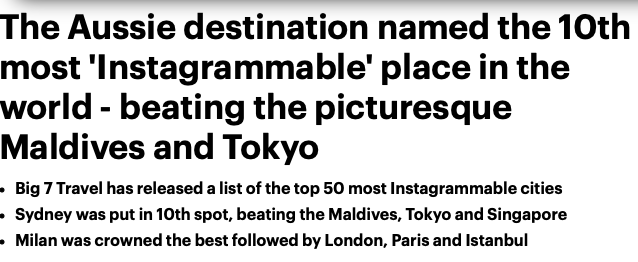 ![]() ![]() 原来,我们的城市 就是别人的诗和远方! 我们一直生活在全世界人的梦想中 在日前出炉的全世界10个最美Instagram打卡地点中,悉尼碾压马尔代、东京等等热门旅游城市,跻身世界前十!妥妥全世界人的梦想! ![]() 这份榜单是根据广大网友在Instagram上的绝美照片和视频数据统计而来。全世界众多城市中,最让人惊艳和印象深刻的景点最多的是出自以下10大城市: 其中,悉尼位列第10,也是澳洲城市第一次跻身前十。而具有人间梦境美誉的马尔代夫,仅仅排在第16位。 ![]() 在大量Instagram高点赞风景照中,悉尼的海港大桥、悉尼歌剧院、Bondi海滩、Manly海滩、The Grounds of Alexandria、Cremorne Point的日落、蓝山、Shelly Beach、婚礼蛋糕岩石、八字游泳池…… 都是全世界游客心中梦寐以求的美景 不计其数的人 不远万里 就为了来悉尼拍一张美美的照片 ![]() 生活在这样的城市,不去好好体验真的是太遗憾了!为了少一点遗憾,我们帮大家整理好多可以在悉尼做的事! 1 坐一次开往环形码头的火车 悉尼的火车有千般万般的缺点,可是,每当火车缓缓驶进Circular Quay,一切的不满都暗淡了。 ![]() 想和你一起坐一趟开往Circular Quay的火车,当火车进站,当站台变成了巨大的取景框,当悉尼港的蓝天白云,歌剧院、海港大桥,成了最美的背景,我们,就是这部偶像剧最甜的主角。 “开往春天的地铁” 应该就是这个样子 ![]() 2 喂一次悉尼港的海鸥 来了悉尼才知道,原来真的有鸟儿不怕人,悉尼港的海鸥就是!听说在悉尼港喂海鸥是需要敢面对千军万马的勇气,以前的我一直不敢。如果有你在,我想鼓起勇气试一试。 ![]() 3 坐一次去Manly的轮渡 从CBD的环形码头出发,跳上一班F1轮渡,仅仅需要30分钟,你就能抵达悉尼人的私藏独家胜地:Manly。 ![]() Manly沙滩细腻,海水清透,落日美绝,这里还是全悉尼最刺激的浮潜地之一。除了这些,Manly的一大法宝就是数不胜数的精品复古小店,和能看到绵延海岸线的世界美食。 只有去Manly轮渡 才能欣赏悉尼港最独特的美 ![]() 4 去QVB看整点的敲钟 在悉尼市中心,有一栋古老的维多利亚女王大厦,这是全世界最美最有韵味的购物中心。而在这座无比瑰丽的建筑中,有两个镇店之宝:皇家大钟(Royal Clock)、伟大的澳大利亚之钟(Great Australia Clock),两座价值千万的大钟,每到半点和整天交错报时。每到整点,钟面的木偶人会为大家演出一场澳洲的迷你历史。 凝视这座大钟 仿佛时间也有了颜色 ![]() 5 看看别样的中国艺术 也许很多华人还不知道,在悉尼的Chippendale,有一座叫做“大白兔”的博物馆(White Rabbit),很低调,也很特立独行。这里是不折不扣的中国当代艺术。一位叫做Judith Neilson的艺术家,在北京邂逅了中国的艺术作品后,爱的无法自拔,自费筹建了这样一座艺术博物馆。 这里展出了不计其数艺术家的作品 才华横溢,超凡脱俗,绝无仅有…… ![]() 6 逛一次最“土”的花店 悉尼人爱自然,也爱花,但对很多悉尼人来说,比娇艳欲滴的玫瑰百合更吸引他们的,是土生土长的澳洲本地花花草草。澳洲气候干燥,孕育的花草也一股子野性。但就是这股野性,成了独特的美。悉尼有很多这样的花店,里面的花草甚至叫不出名字,却有一种无法言说的美。 ![]() 7 做一次敞篷观光车 在一个城市待久了,总会失去新鲜感,而找回新鲜感最好的办法,就是以游客的心态,再看看这座城市。悉尼CBD的敞篷观光车,就是“最游客”的选择。 ![]() 8 去一次清晨的健身房 这是个热爱运动的城市。悉尼究竟有多少健身房,真的数也数不清。而且大多数健身房都是24小时不打烊。来悉尼之前,你或许想不明白,究竟什么人会在凌晨去健身房。不妨早起一次,去看看清晨四五点的健身房,偶遇城市里那些努力的人们…… ![]() 9 在大教堂寻找平静 悉尼教堂众多,但第一个要提的当然就是圣玛利大教堂。位于悉尼CBD,海德公园旁的圣玛利大教堂,是悉尼最大的罗马天主教教堂,也是大主教所在地。 ![]() 不仅仅教堂本身外形优雅,周围的环境更是无可挑剔。精心修剪的草坪,宽阔的广场和水池,都让这座教堂成为悉尼最靓丽的风景。 很多人会专门来这里的广场上坐着 寻找一种内心的平静 ![]() 10 去小粉墙拍一组美美的照片 大名鼎鼎的网红小粉墙,坐落在悉尼的岩石区,就在悉尼当代艺术博物馆正背面。整整一条街都很适合拍照。 ![]() ![]() 11 去古董电影院看场老电影 1940年,好莱坞著名的电影公司派拉蒙在悉尼总部的办公楼建了一家电影院,就在地下室,专门用来点映当时发行的新片。后来这些派拉蒙的新片成了电影史上永久的经典,而这家建在地下室的小小的放映厅也被用心的翻修,成了现在像电影场景一样精致的存在。 ![]() 12 坐一次猎人谷的热气球 猎人谷绝对可以满足你浪漫的愿望,也绝对是一次你和心上人的记忆最深刻的一次旅行。如果她恰巧还爱品酒,猎人谷足以让她心醉,那里有太多的酒庄,而且品酒还免费! ![]() 13 去悉尼歌剧院看一场演出 看过了悉尼歌剧院,怎么能不亲自感受一下里面的歌舞剧表演呢!在这个举世闻名的剧院里,沉浸在精彩的歌舞声中,自由地与演员们互动,这样的感受一定终身难忘! ![]() 14 去Bondi来一次海湾漫步 悉尼有最为壮阔的海岸风景线,多数游客来到这里,都会选择乘船来欣赏这独一无二的景色!可是今天小悉帅要告诉你,欣赏海岸风景线最适合的方式,其实是——步行!邦迪到勃朗特,这是大